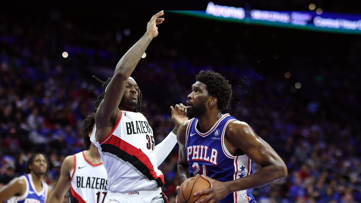 ----- Joel Embiid dominated action with 35 points, 15 rebounds, and seven assists as the Philadelphia 76ers defeated the Portland Trail Blazers 126-98 Sunday afternoon at Wells Fargo Center in Philadelphia.